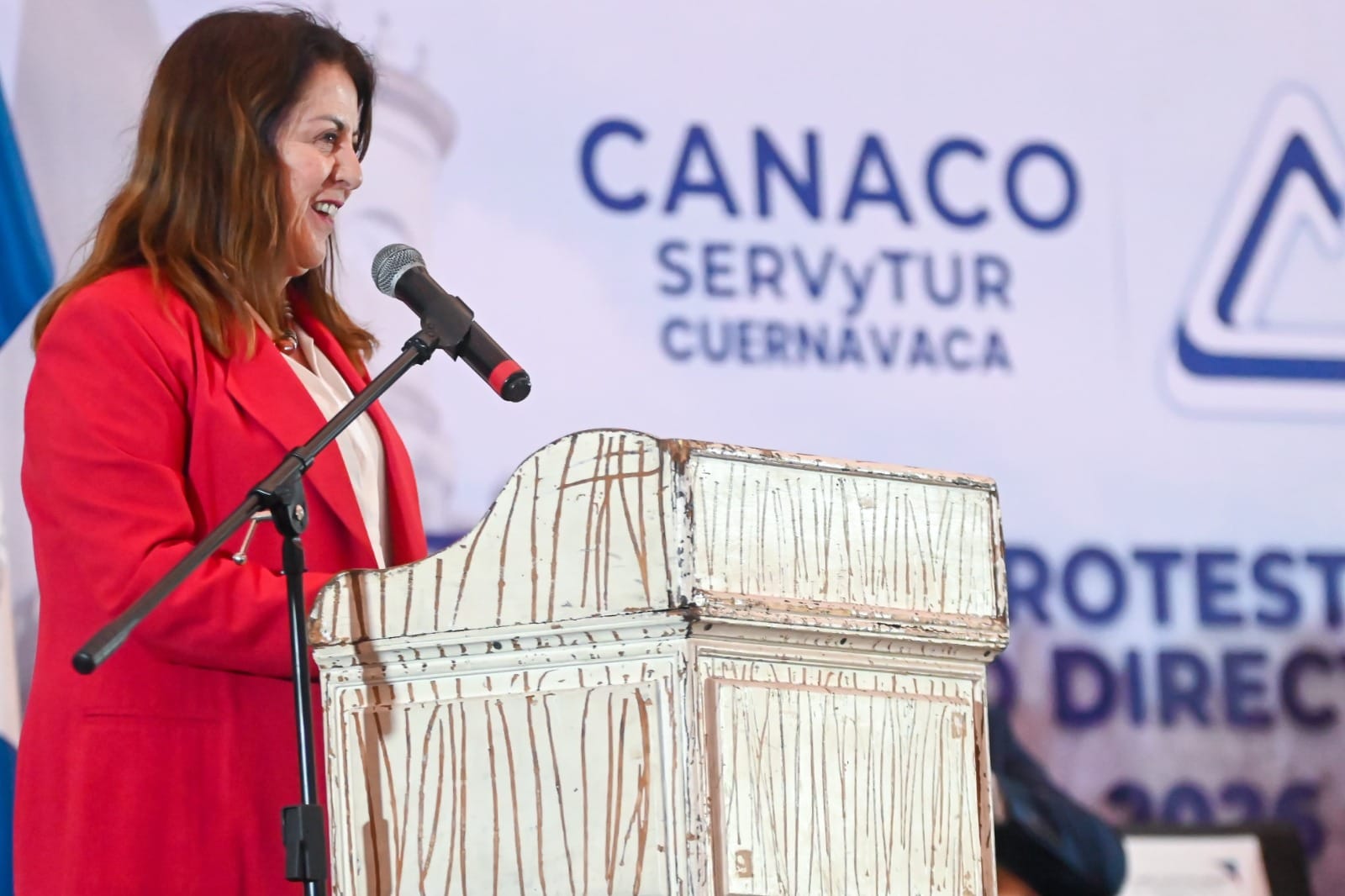 La presentación de dichas estrategias las realizó al ser invitada especial de la toma de protesta del Consejo Directivo 2025-2026 de la Cámara Nacional de Comercio, Servicios y Turismo (Canaco ServyTur) Cuernavaca, que se llevó a cabo en el Museo de la Ciudad de Cuernavaca.