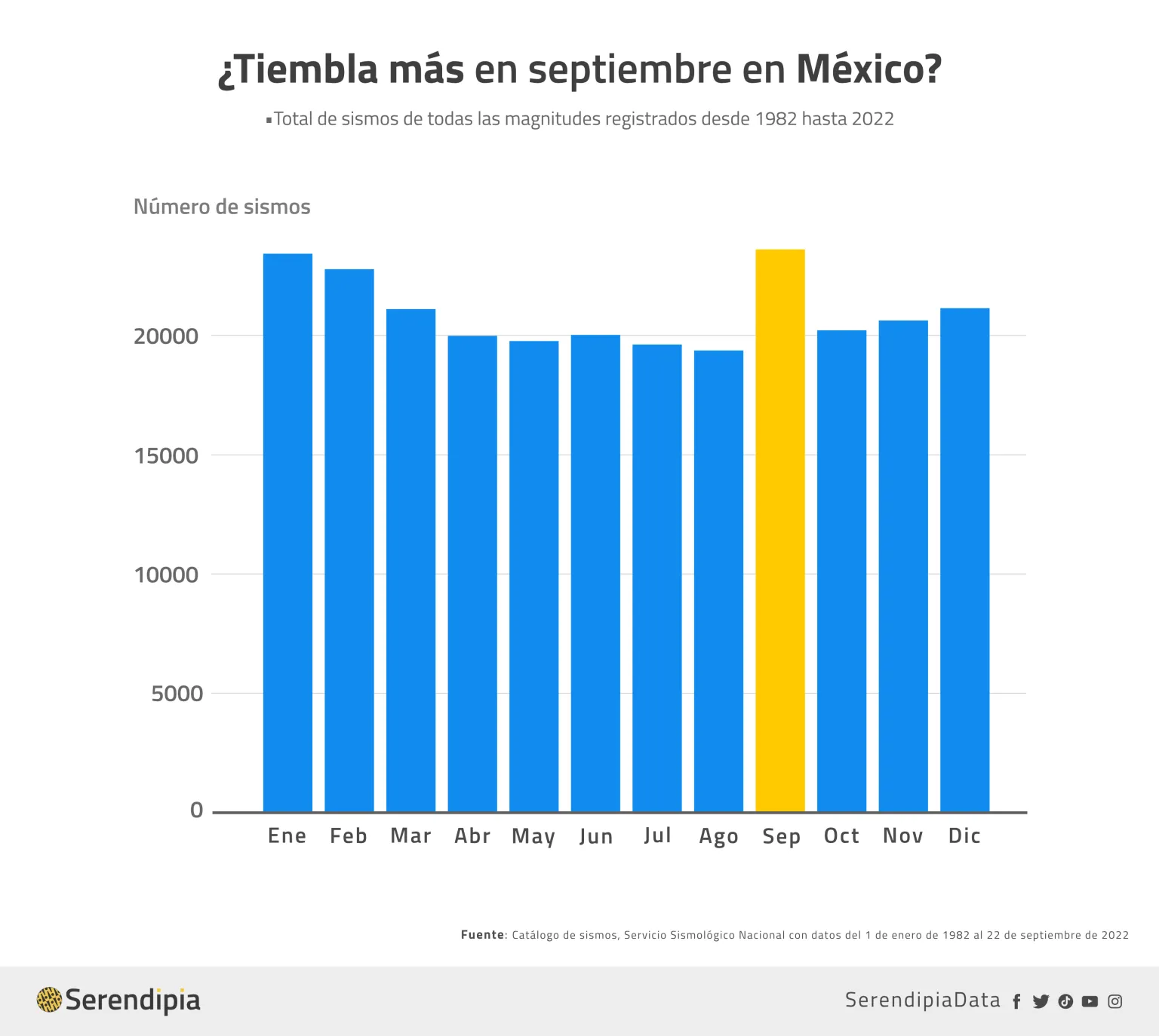 Los graves terremotos de 2017 y 2019 en México, por ejemplo, son producto de una simple coincidencia. Sin embargo, septiembre sí concentra la mayoría de los sismos con magnitud mayor a 5.5 grados en la escala de Richter desde 1982, de acuerdo con los datos del Servicio Sismológico Nacional (SSN).