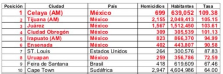 Según información presentada por el Consejo Ciudadano para la Seguridad Pública y la Justicia Penal en el ranking mundial de las 50 ciudades más violentas del mundo aparecen 6 municipios mexicanos en el top 10.