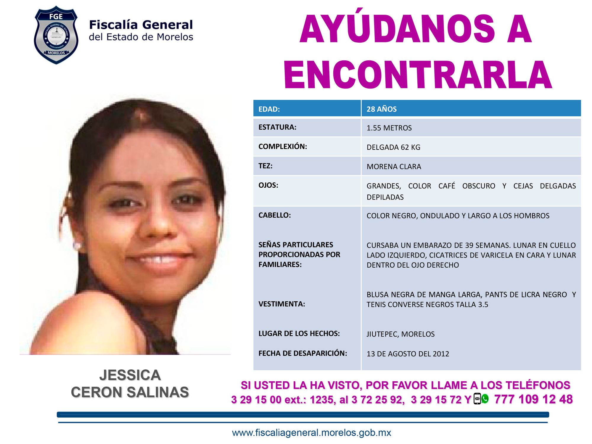 A través de redes sociales, la señora Celia Salinas compartió un emotivo mensaje tras cumplirse 8 años de la desaparición de su hija Jessica Cerón Salinas quien se encontraba embarazada al momento de no localizarla, el 13 de agosto de 2012 en el municipio de Jiutepec, Morelos.