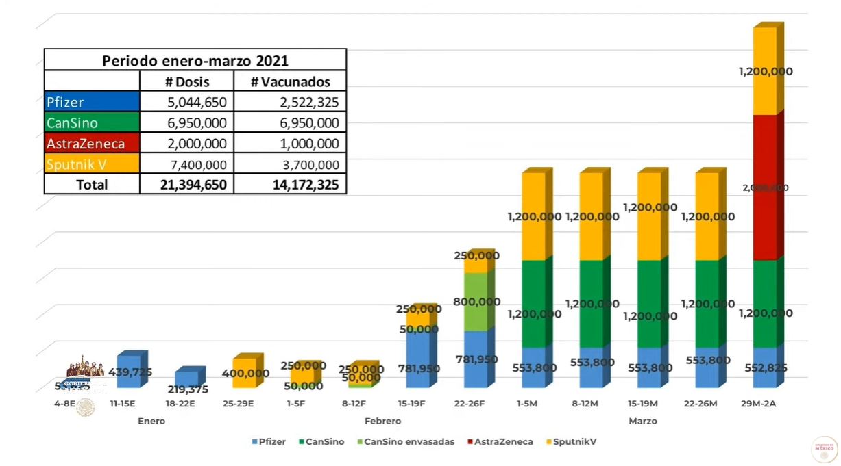 Se estima que México reciba 21 millones 394 mil 650 dosis durante este tiempo, las cuales serían enviadas por Pfizer-BioNTech; CanSino; AstraZeneca y Sputnik V.