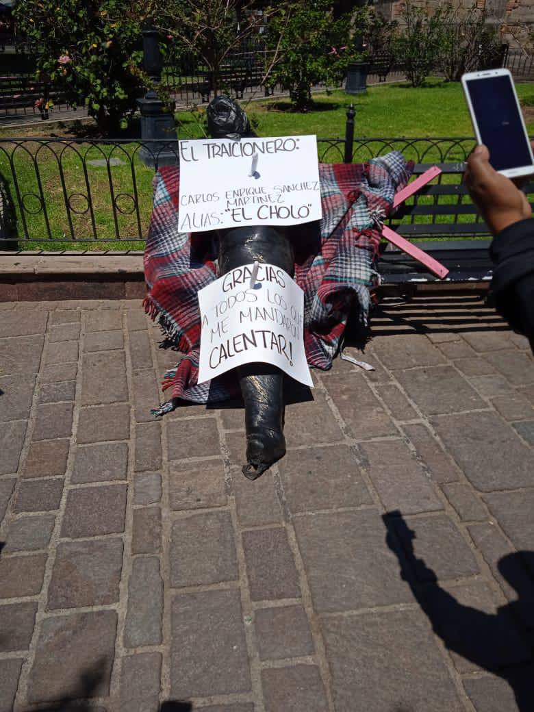 Entonces los sujetos se aproximan a una de las bancas y dejan el bulto con forma humana “sentado” sobre ella. A este le colocan la cobija y clavan las cartulinas con cuchillos para después irse a toda velocidad. Es entonces que la gente en el lugar se acerca y se percata de que es un cuerpo humano embolsado.