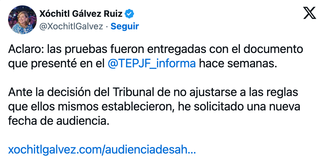 En una publicación en su cuenta de X (anteriormente Twitter), Gálvez criticó al TEPJF por lo que consideró una violación de sus propios acuerdos. Señaló que fue notificada con muy poca antelación y se encontraba fuera de la Ciudad de México, lo que hizo imposible su asistencia.