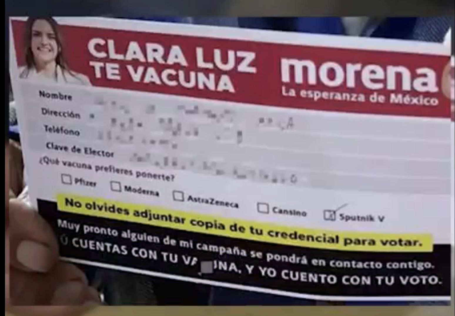 Sin embargo, ahora es en el estado de Nuevo León donde ha aparecido un formato idéntico al repartido en la Ciudad de México, donde se asegura que la candidata de MORENA a la gubernatura de aquella entidad, Clara Luz Flores, repartirá la fórmula de vacuna de tu preferencia, siempre que entregues datos personales y una copia de tu credencial de elector al brigadista que visita tu hogar.