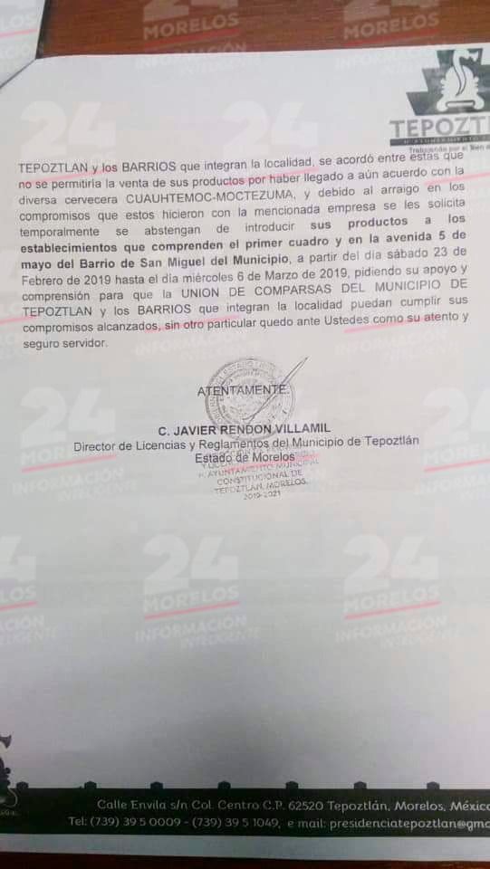 Ante esto, pobladores de Tepoztlán se encuentran molestos, ya que vendedores de tiendas de abarrotes afirman que con esto sus ventas disminuirán considerablemente y no es justo que se les imponga una marca específica, siendo que siempre ha existido libertad para escoger cuál cerveza vender en sus comercios.
