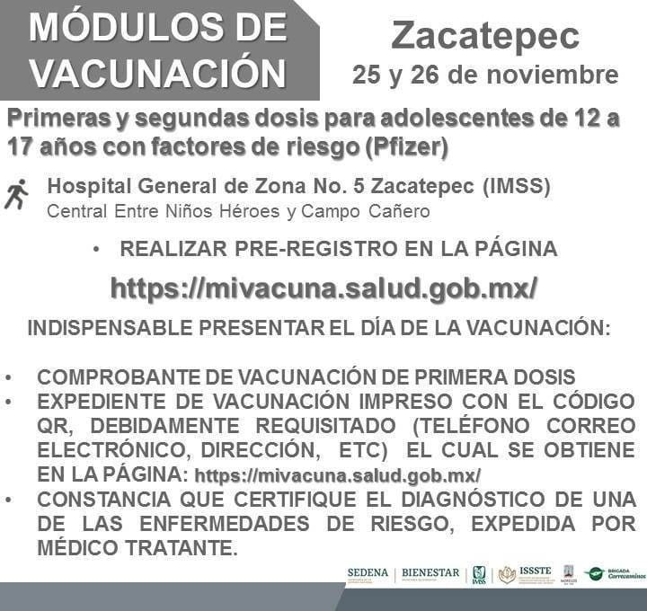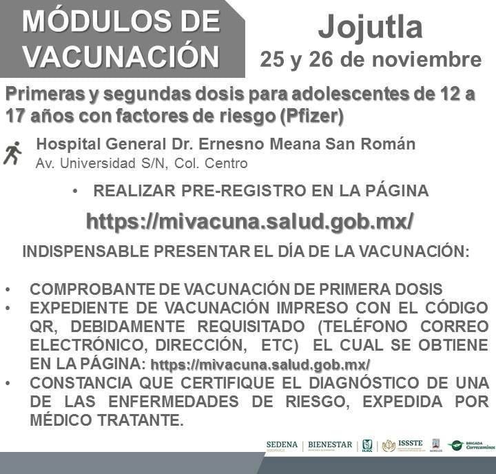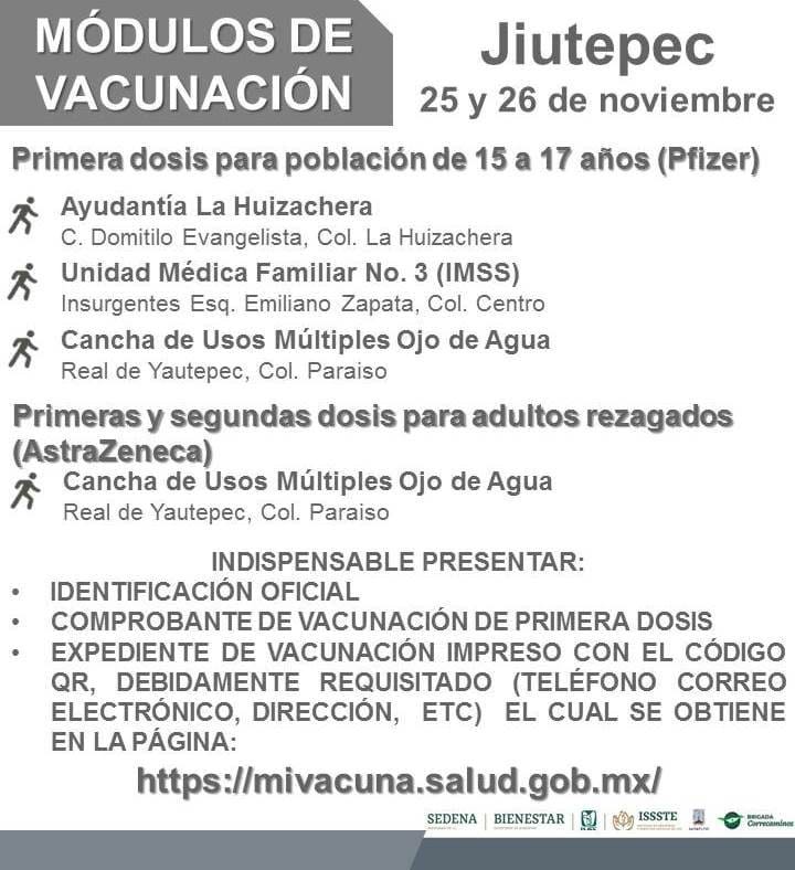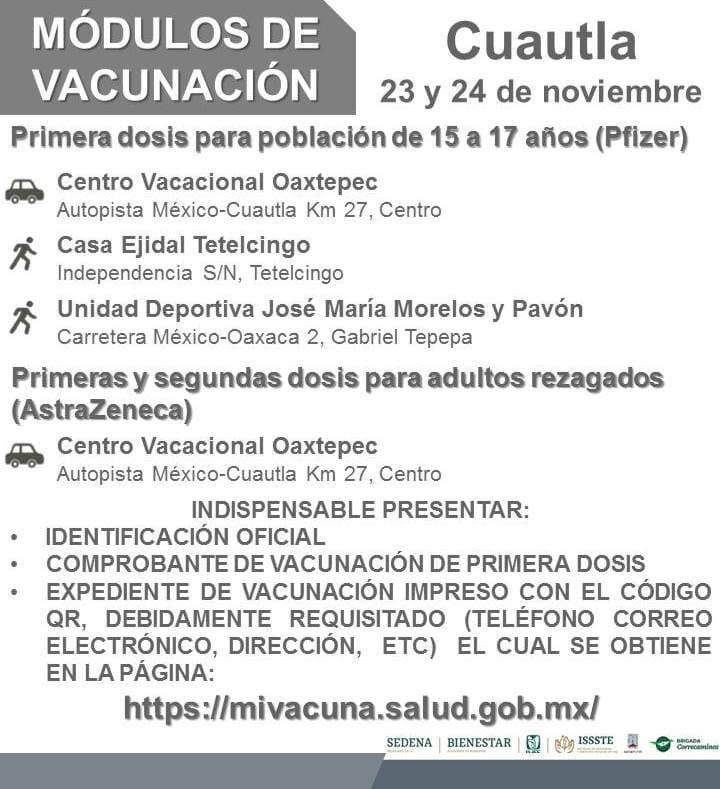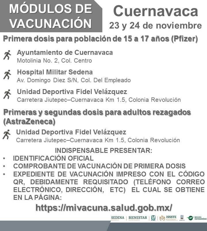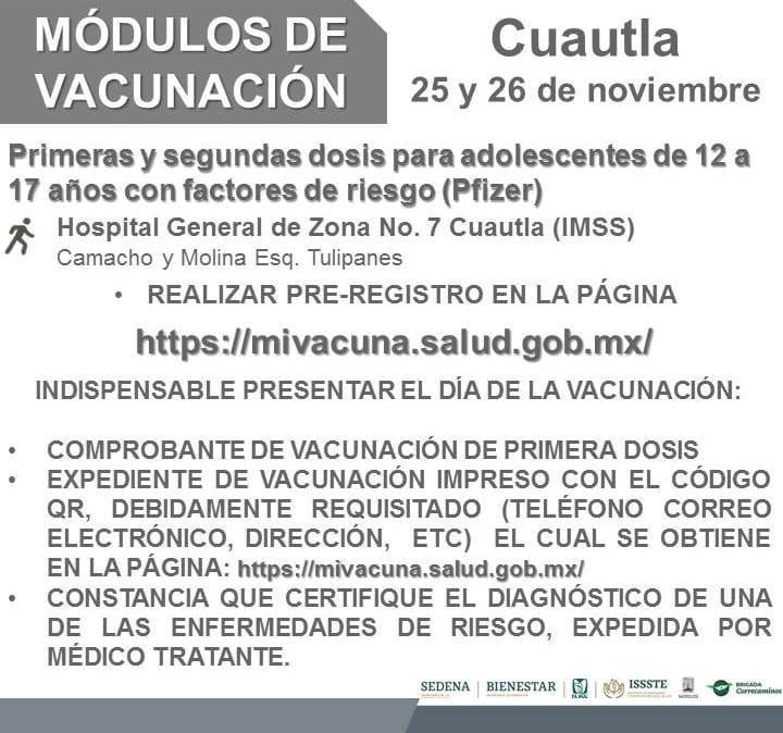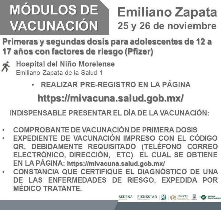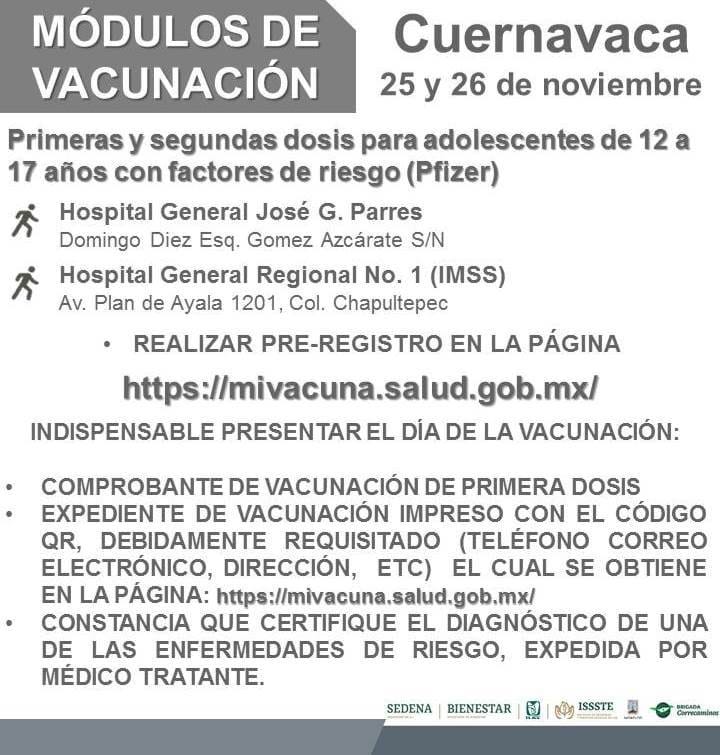 Autoridades de vacunación en Morelos anunciaron las fechas y módulos en que se aplicará la dosis de Pfizer a adolescentes de 15 a 17 años de edad en los siguientes municipios, así como también, para adolescentes con factores de riesgo.
