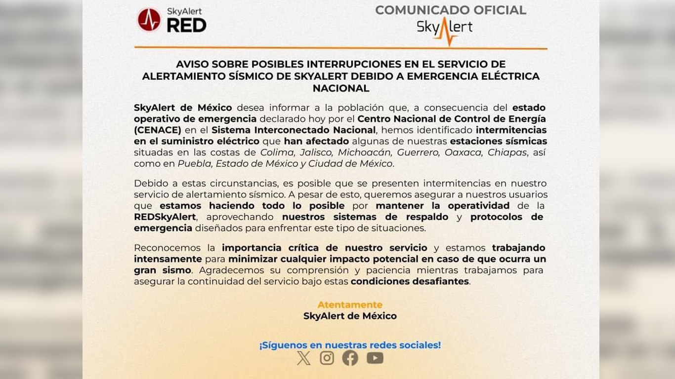 A través de un comunicado difundido hace unos minutos, Sky Alert de México informó que, a consecuencia de los apagones registrados esta noche en al menos 18 entidades del país, por el estado de emergencia en el que se encuentra el sistema interconectado nacional; algunas de sus estaciones de monitoreo de actividad sísmica han presentado intermitencias en su operación, lo que podría provocar fallas en los sistemas de alerta.