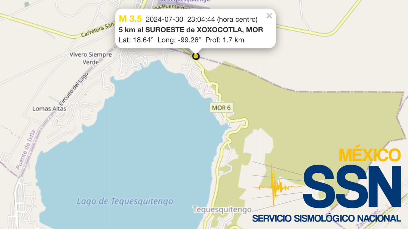Morelos apareció en el reporte de sismicidad de esta noche con un temblor de baja intensidad, originado a 5 kilómetros al suroeste de Xoxocotla, cerca del Lago de Tequesquitengo, con una magnitud de 3.5, registrado a las 23:04 horas.