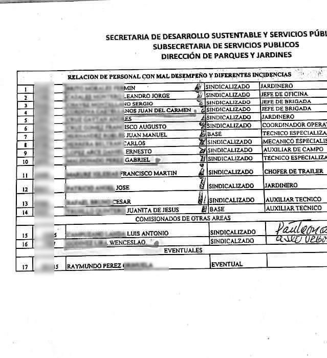 Resalta que de los 17 trabajadores, 14 son sindicalizados y se desempeñaban en la Secretaría de Desarrollo Sustentable y la Dirección de Panteones, siendo puestos de jardineros; barrenderos, entre otros.