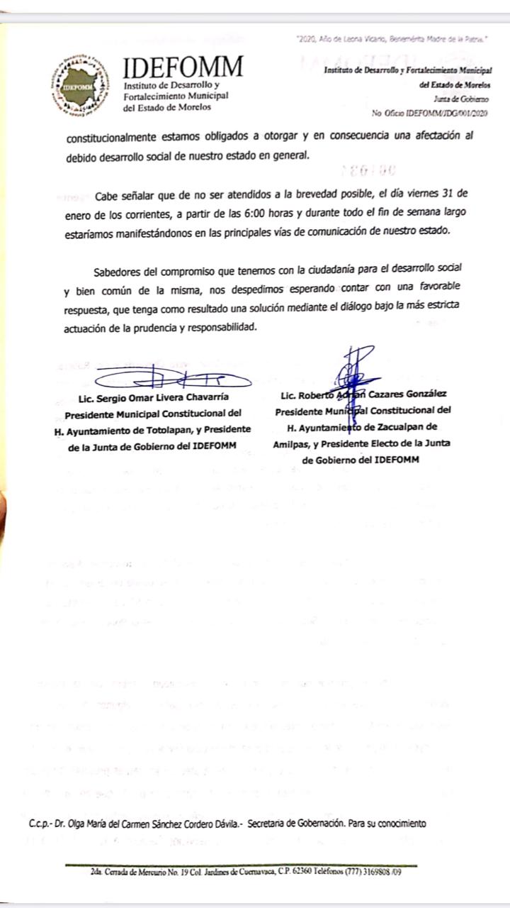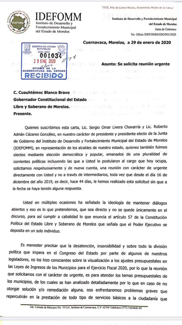 A través de una carta que dirigieron al gobernador del Estado, Cuauhtémoc Blanco Bravo, presidentes municipales e integrantes del IDEFOM solicitaron la instalación de una mesa de diálogo, en la que participe, personalmente el mandatario, esto ante la desesperación de los ediles por la falta de aprobación en el Congreso local de sus leyes de ingresos 2020.