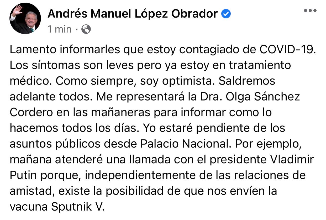 Hace unos momentos el Presidente Andrés Manuel López Obrador confirmó que dio positivo a COVID-19.