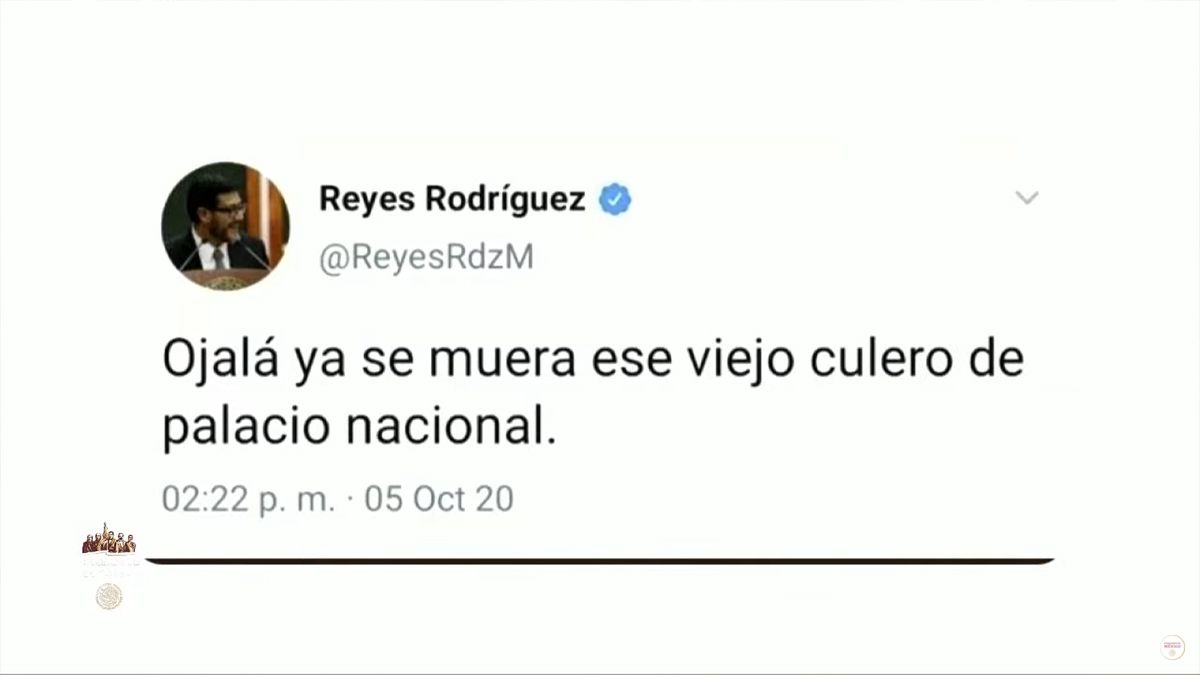 Después, el presidente de México mostró en la pantalla un tuit donde el nuevo presidente del TEPF presuntamente lo insulta y le desea la muerte, frase escrita supuestamente en octubre de 2020, es decir, hace un par de meses y cuando el abogado ya era Magistrado de este órgano institucional.