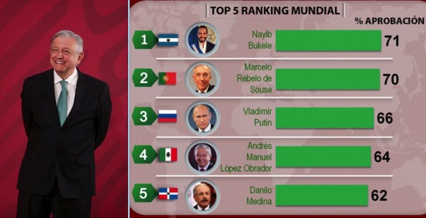 La consulta indica que AMLO es el segundo presidente mejor calificado, sólo por debajo del recién electo Nayib Bukele, presidente de El Salvador.