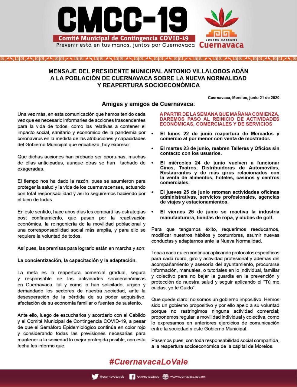 Pese a estar aún en alerta máxima de acuerdo al semáforo epidemiológico de la secretaría de Salud Federal, el presidente municipal de Cuernavaca, Antonio Villalobos, anunció la reapertura de actividades a partir de este 22 de junio, de la siguiente manera: