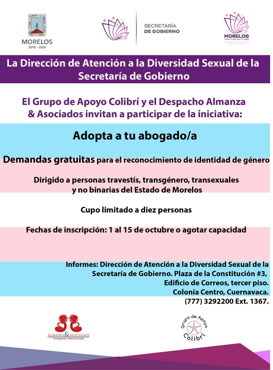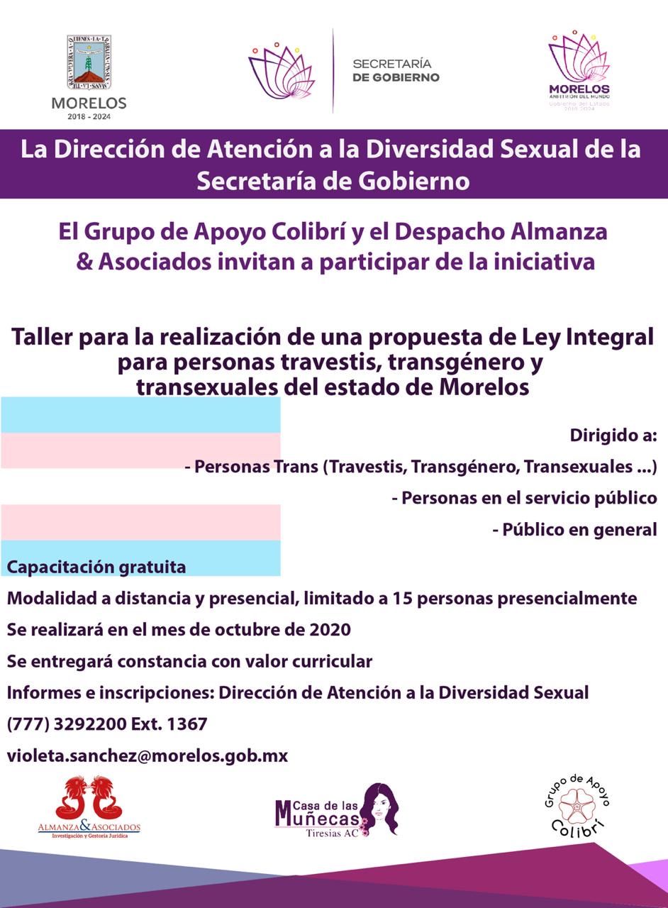 En conjunto con la Dirección de Diversidad Sexual del Estado de Morelos, el Grupo de Apoyo Colibrí, Casa de las Muñecas Tiresias y el despacho jurídico Almanza&Asociados, se realizará un taller para la propuesta de una “Ley Integral para Personas Travestis, Transgénero y Transexuales del Estado de Morelos”.