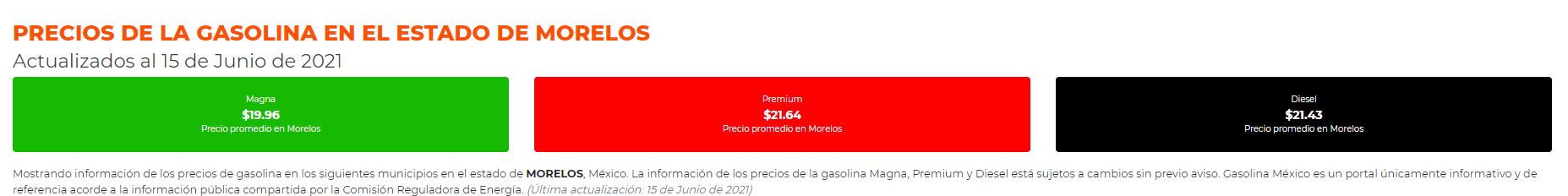 Para que usted como ciudadano se dé una idea sobre el precio de la gasolina en Morelos, los costos oscilan entre los 19.96 pesos en la gasolina magna, 21.64 pesos la premium y 21.43 pesos el diésel.