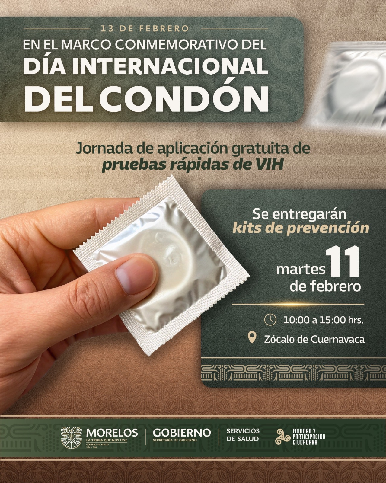 En el marco del Día Internacional del Condón que se instituye el 13 de febrero, la Dirección General de Derechos Humanos y Diversidad Sexual de la Secretaría de Gobierno, en coordinación con la Secretaría de Salud, Servicios de Salud Morelos (SSM) y la Asociación Civil Equidad y Participación Ciudadana, llevarán a cabo una Jornada de Aplicación Gratuita de Pruebas Rápidas de VIH.