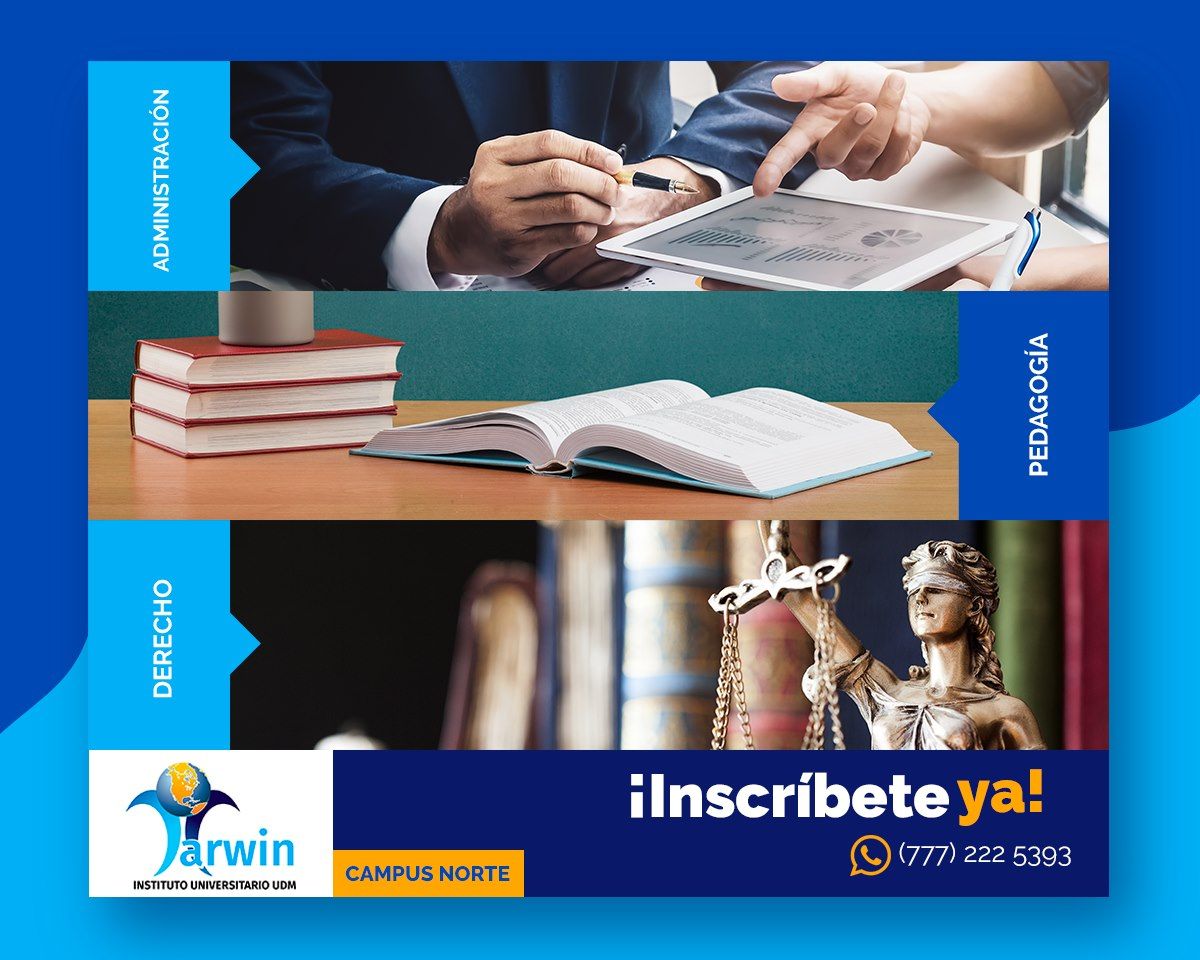 Instituto Universitario Darwin Campus Norte, en Cuernavaca,ofrece las licenciaturas de Derecho, Pedadogía y Administración, con Reconocimiento de Validez Oficial de Estudios (RVOE).