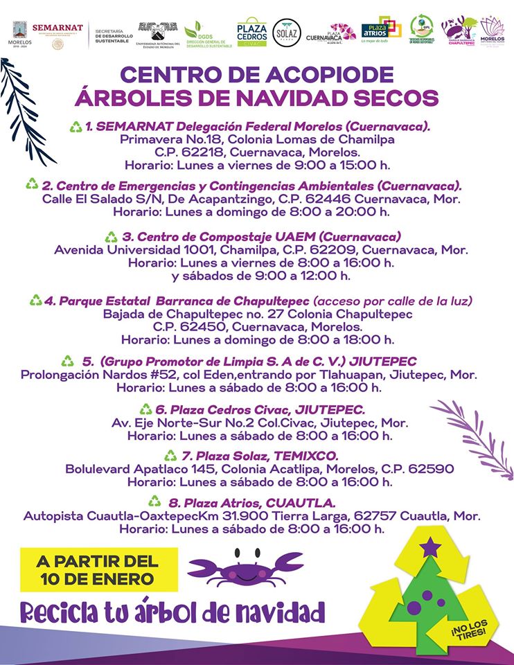 Monica Elena Flores, directora de Biodiversidad en Morelos informó que son varios centros de acopio, ubicados algunos en plazas comerciales, donde se recibirán los árboles hasta el próximo 7 de febrero para someterlos a procesos que los conviertan en abonos orgánicos.