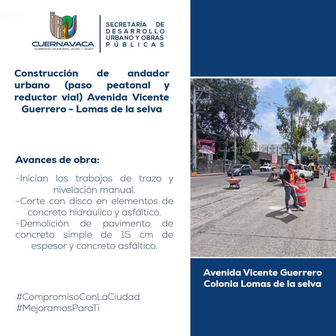El Ayuntamiento de Cuernavaca dio inicio a la construcción de un andador urbano sobre la avenida Vicente Guerrero, en la colonia Lomas de la Selva, una zona con alto flujo peatonal y vehicular.