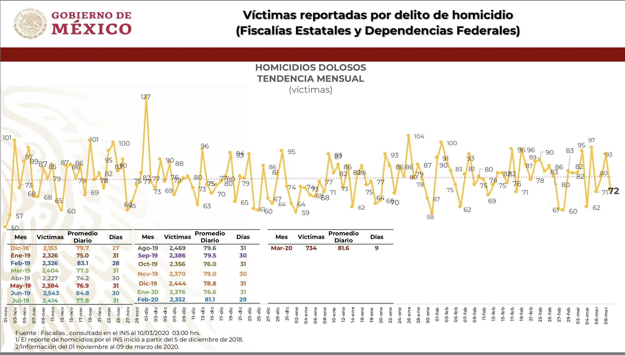 El mandatario presentó las estadísticas de muertes dolosas registradas alrededor del país desde inicios de enero, y la tendencia de asesinatos por mes desde noviembre, con estadísticas a la baja en los últimos dos días.