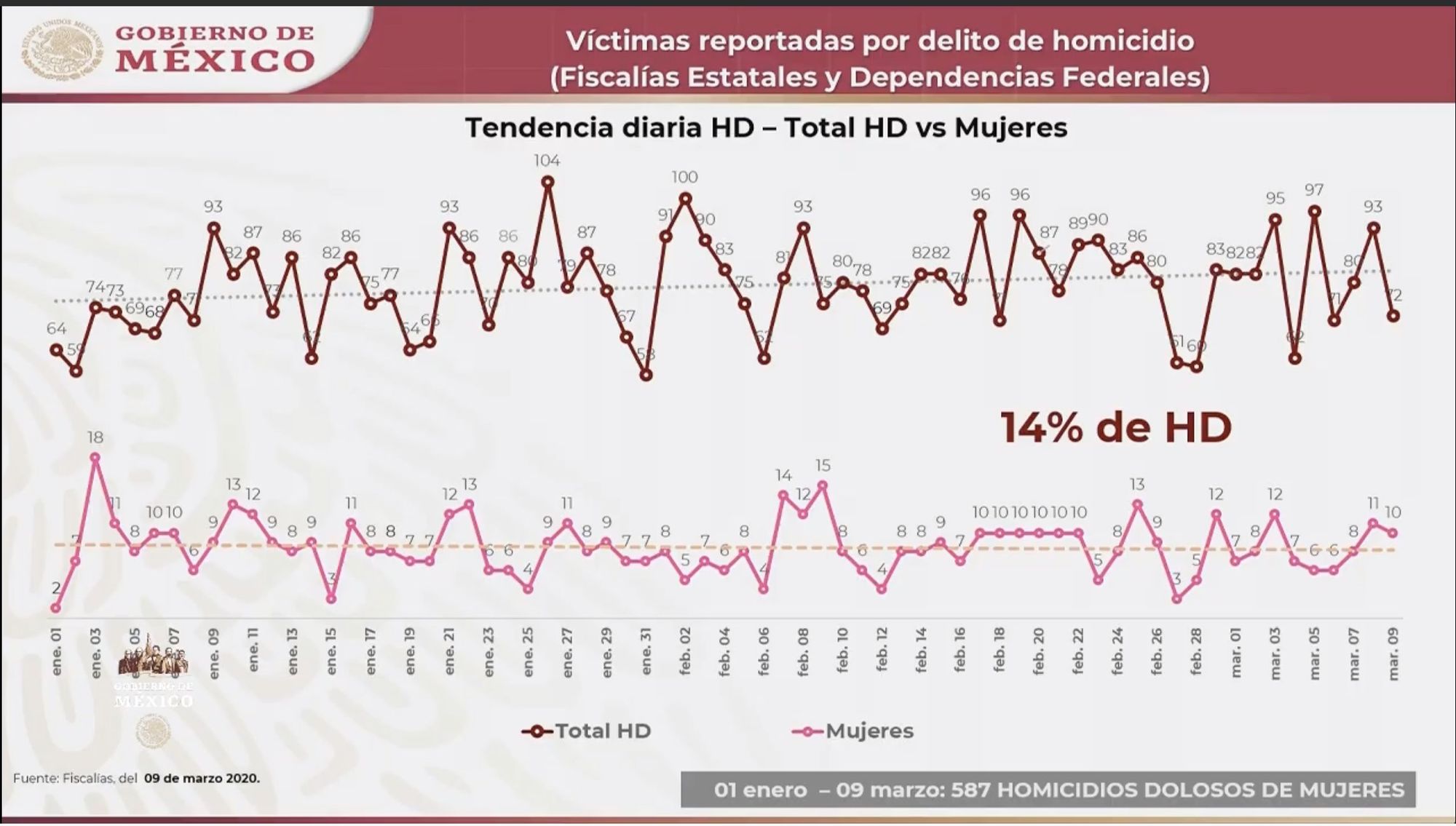 De acuerdo con las cifras de la Comisión Nacional de Seguridad, y presentadas hoy por el presidente Andrés Manuel López Obrador, entre el 8 y 9 de marzo bajaron los índices de homicidio, pero asesinaron a 21 mujeres.