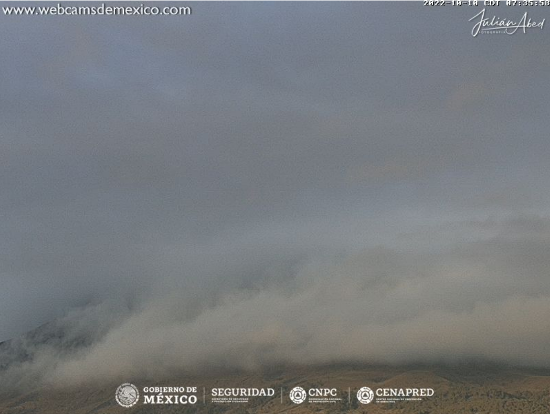 Este lunes 10 de octubre así amanece el volcán Popocatépetl visto desde San Nicolás de los Ranchos, Puebla.