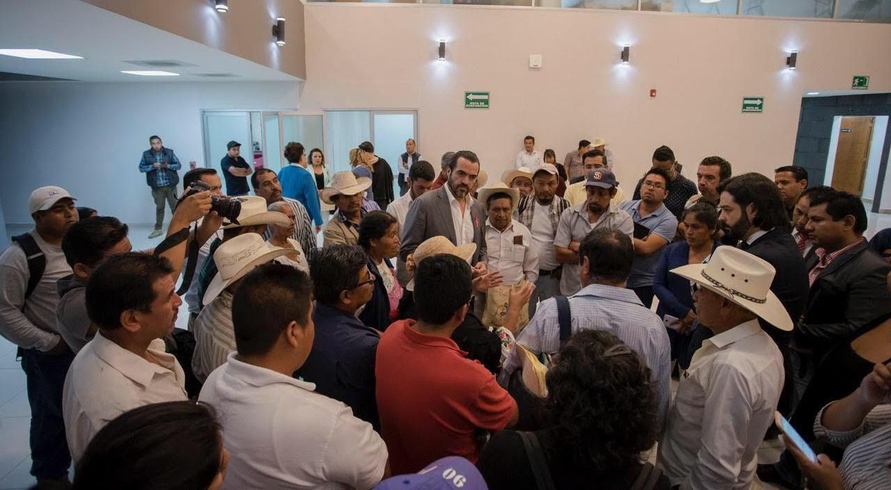 El secretario de Gobierno, Pablo Ojeda, en compañía del coordinador de Asesores, Mauricio Robles Cortés, y del encargado de despacho de la Subsecretaría de Gobierno, Mauricio Termignoni Apodaca, sostuvo una mesa de trabajo con autoridades y ciudadanos del municipio indígena de Hueyapan, en el Salón de Comisiones del Congreso del Estado.