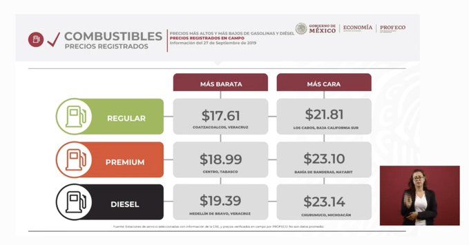 Y en el precio del Diésel, el más económico fue de 19 pesos con 39 centavos y el más elevado fue de 23 pesos con 14 centavos.