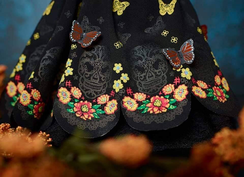 Su vestido es largo, bordado y decorado con flores y mariposas. El look se termina con una corona con mariposas y la típica flor de cempasúchil.