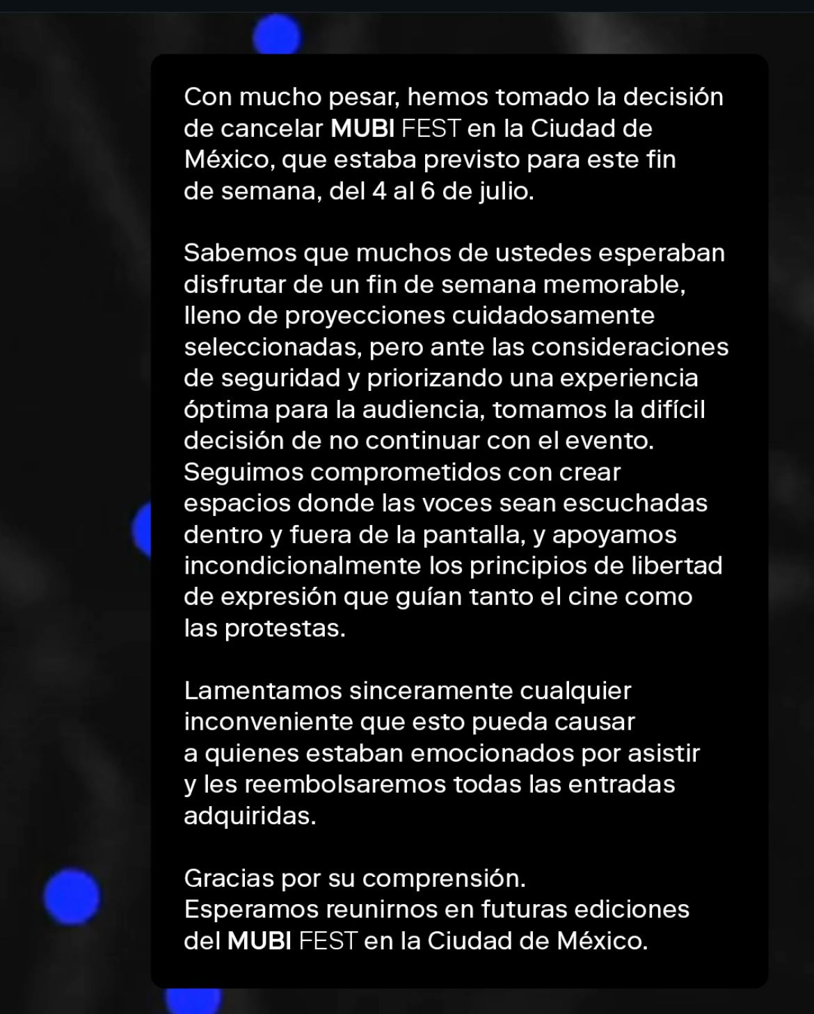Finalmente, en el caso de la CDMX, MUBI confirmó que habrá reembolsos para quienes ya habían adquirido entradas, y se espera que se den a conocer más detalles en los próximos días.