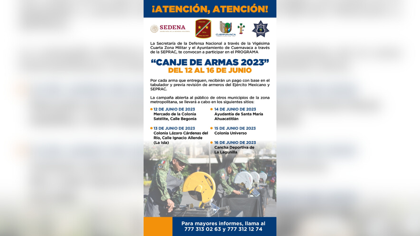 El Ayuntamiento de Cuernavaca y la Sedena hacen el llamado para participar en el programa Canje de Armas, con el que buscan promover la cultura de la paz y convivencia pacífica, al proporcionar incentivos para que las personas entreguen sus armas, se busca generar conciencia sobre los riesgos asociados con su posesión y uso.