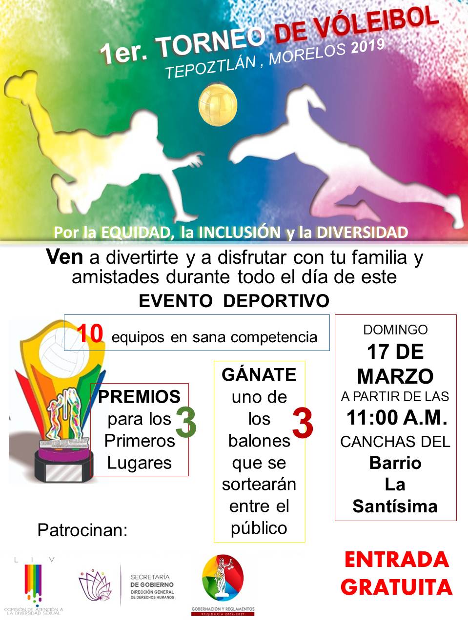 En el municipio de Tepoztlán se llevará a cabo el Primer Torneo de Vóleibol para promover y fortalecer la cultura de inclusión y el respeto a la diversidad sexual, mismo que tendrá lugar el próximo domingo 17 de marzo en las canchas del Barrio La Santísima.