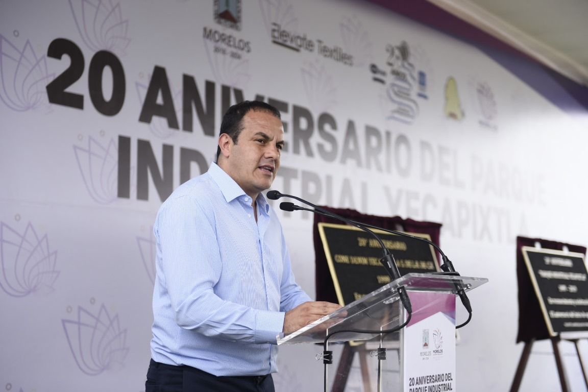 El mandatario estatal acudió a la celebración del 20 aniversario de inicio de operaciones del Parque Industrial Yecapixtla, en donde asisitieron representantes de las industrias Elevate Textiles, CONEDENIM y Casimires Burlmex, las cuales generan alrededor de dos mil 300 empleos directos.