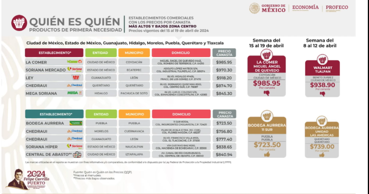 Durante la semana del 15 al 19 de abril, la tienda, que se encuentra junto al Paseo Cuauháhuac, registró precios de la canasta básica de apenas $756.80 pesos. En contraste, la Comer situada en Miguel Ángel de Quevedo #443, en la alcaldía Coyoacán de la Ciudad de México, marcó el precio más alto de la región con $985.95 pesos por la misma canasta en el mismo período.