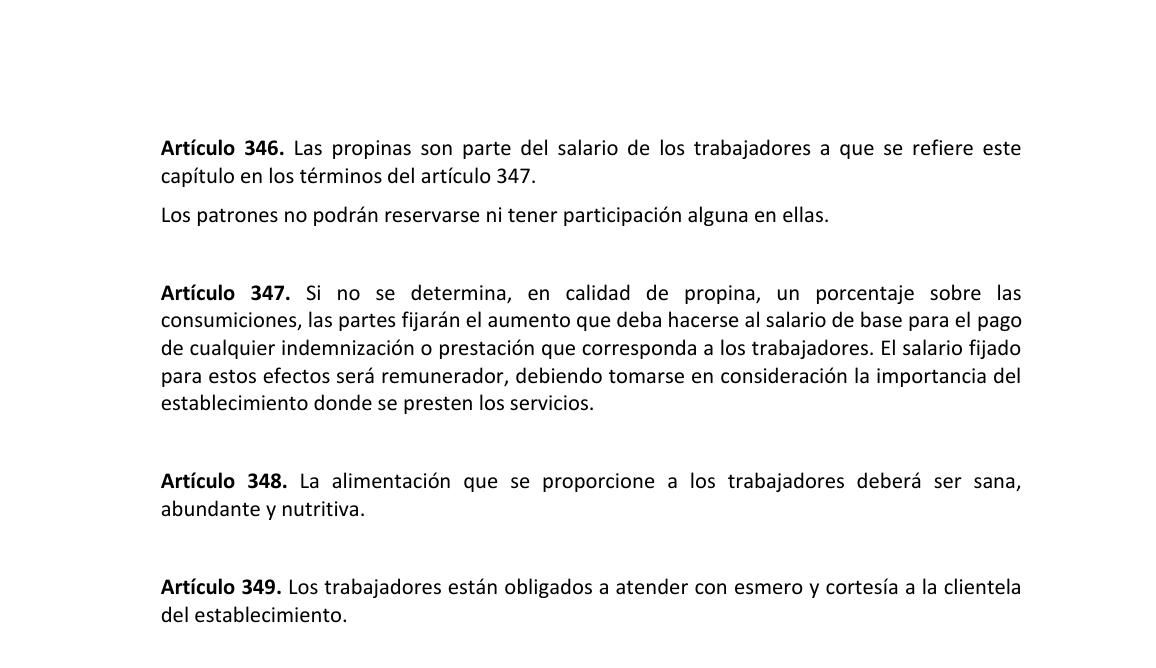 Según el Servicio de Administración Tributaria (SAT) y el artículo 346 de la Ley Federal de Trabajo, las propinas que perciben todos los trabajadores de hoteles, restaurantes, fondas, casas de asistencia, cafés, bares y otros establecimientos análogos, son parte del salario del trabajador, por lo que se debe de aplicar el Impuesto Sobre la Renta (ISR) como a cualquier empleado.