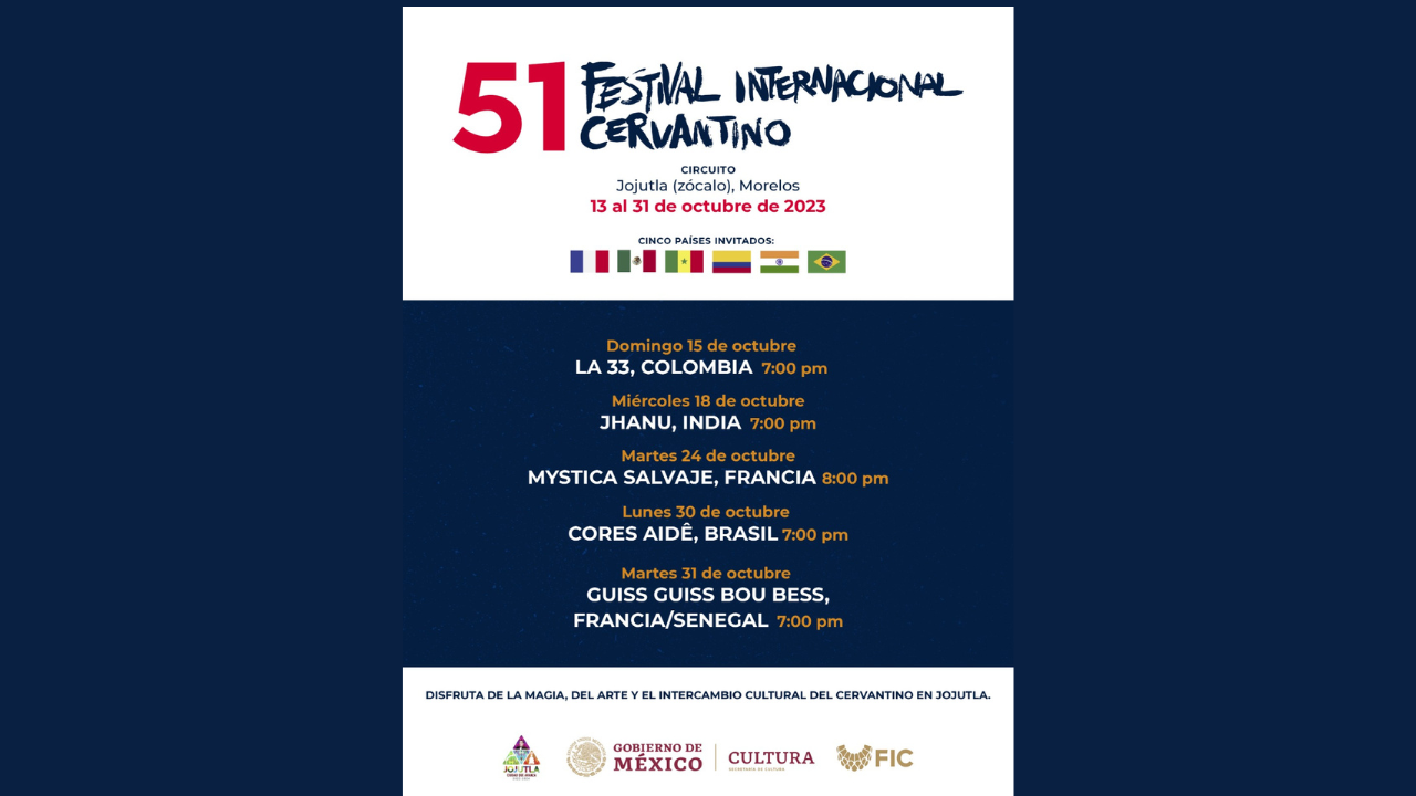 A partir de este viernes 13 de octubre, comienzan las actividades del Festival Internacional Cervantino en el Estado de Guanajuato. Sin embargo, Jojutla se unirá a este circuito durante el fin de semana, las presentaciones serán gratuitas, comenzarán a las 19 horas y se llevarán a cabo en el zócalo municpal.