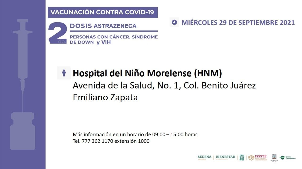 Es decir, todos aquellos mayores de 18 años con padecimientos como VIH, Cáncer y Síndrome de Down recibirán la segunda dosis de AstraZeneca en el Hospital del Niño Morelense.