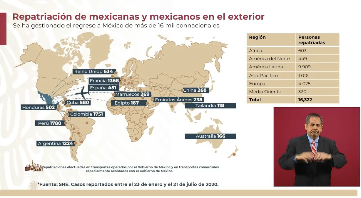 Por otro lado, informó que 16 mil 322 mexicanos han sido repatriados desde diferentes países, la mayoría provenientes de América Latina, seguido por Europa y Asia-Pacífico.