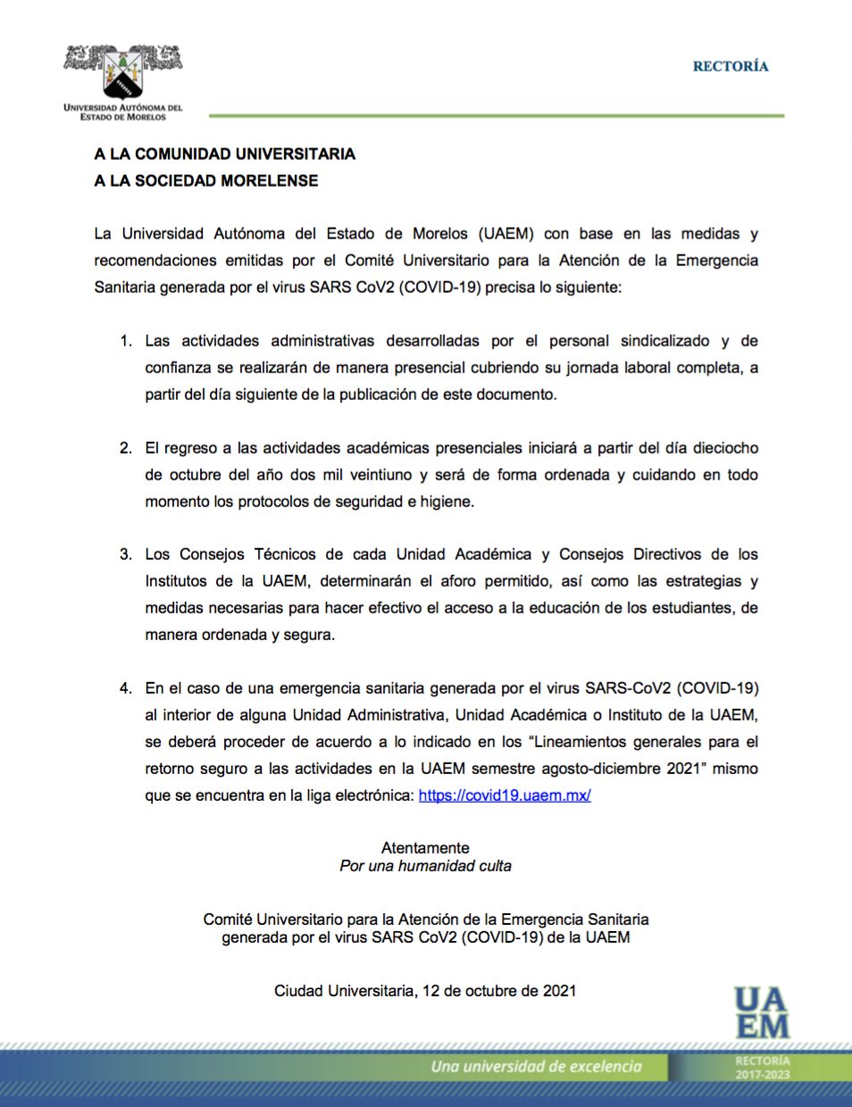 La Universidad Autónoma del Estado de Morelos (UAEM) confirmó a través de un comunicado, que este lunes 18 de octubre regresarán a actividades académicas presenciales.