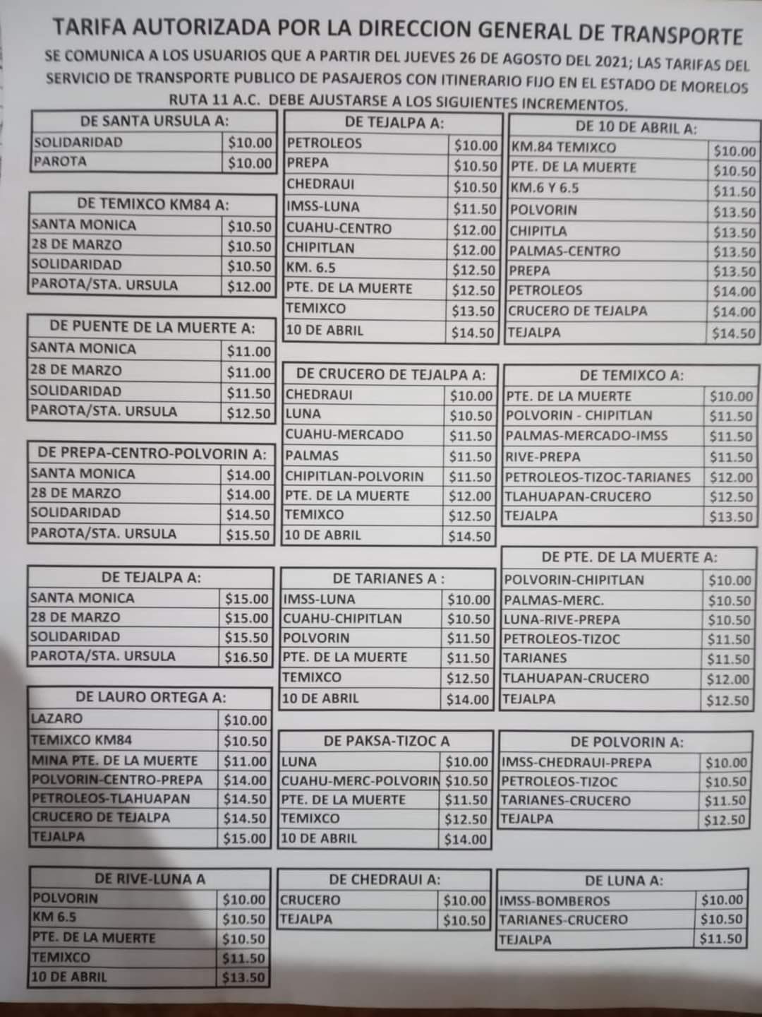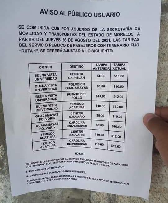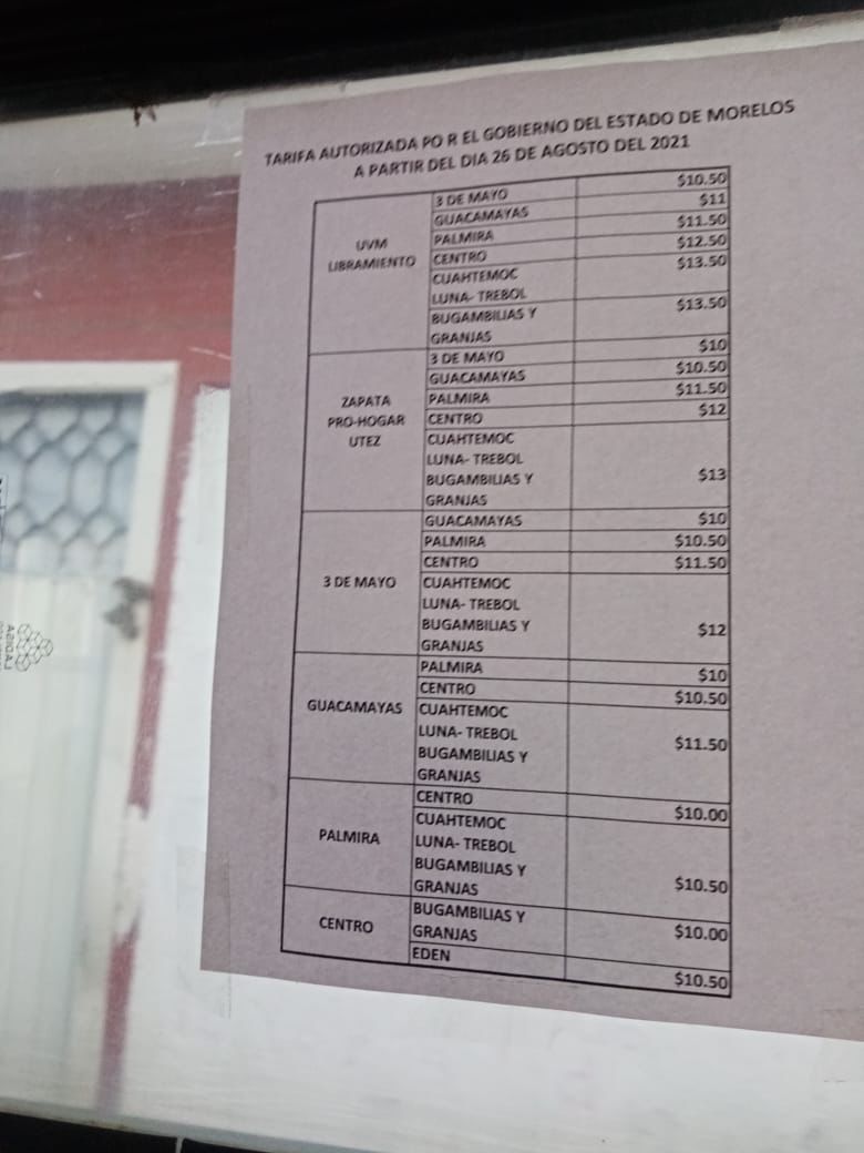Conoce aquí los tabuladores de precios en algunas rutas de Morelos.