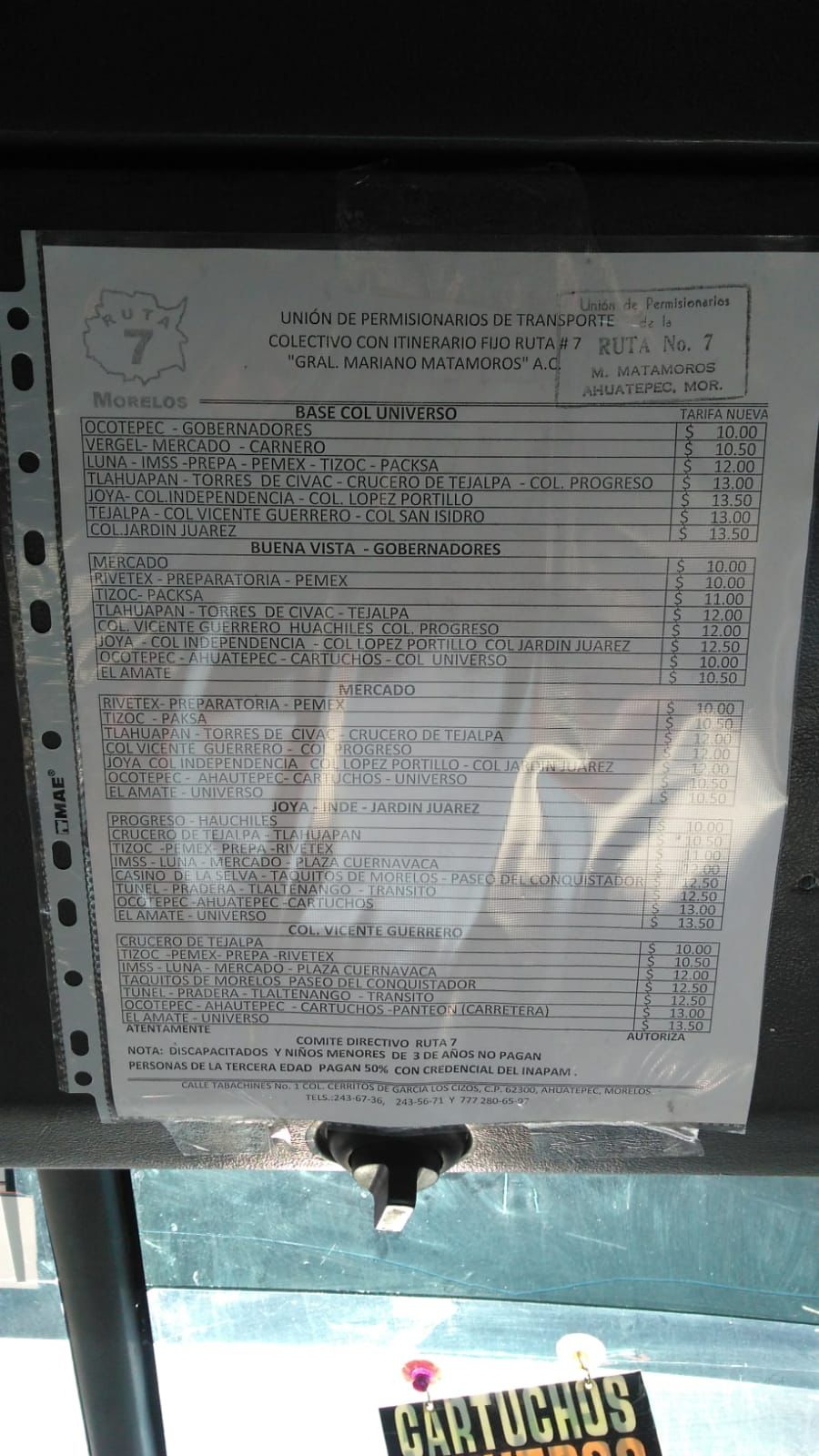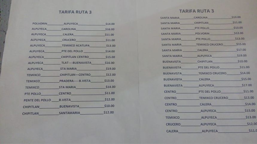 Para el conocimiento de todos los usuarios, la mayoría de los choferes llevan en las unidades un tabulador en el que se señalan los precios de cada trayecto que realice el ciudadano.