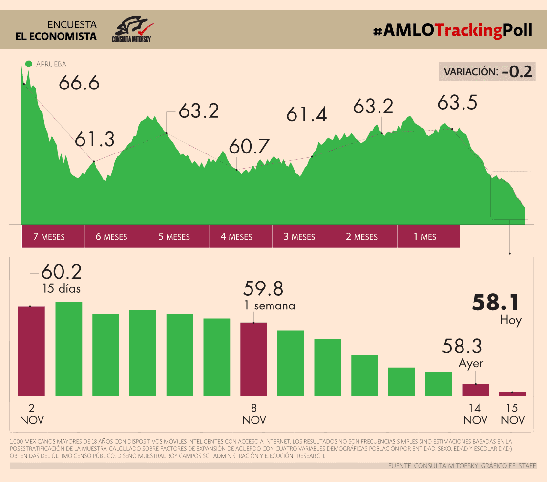 Esta encuesta se realiza diariamente y al día votan más de mil mexicanos mayores de edad. Tan solo la semana pasada, el 8 de noviembre , el porcentaje era de 59.8 %, bajando siginficativamente para esta semana.