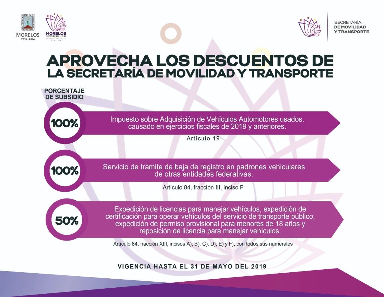 Autoridades de la Secretaría de Movilidad y Transporte informaron que la dependencia continúa efectuando los descuentos del 100 y del 50 por ciento en diversos trámites y servicios.