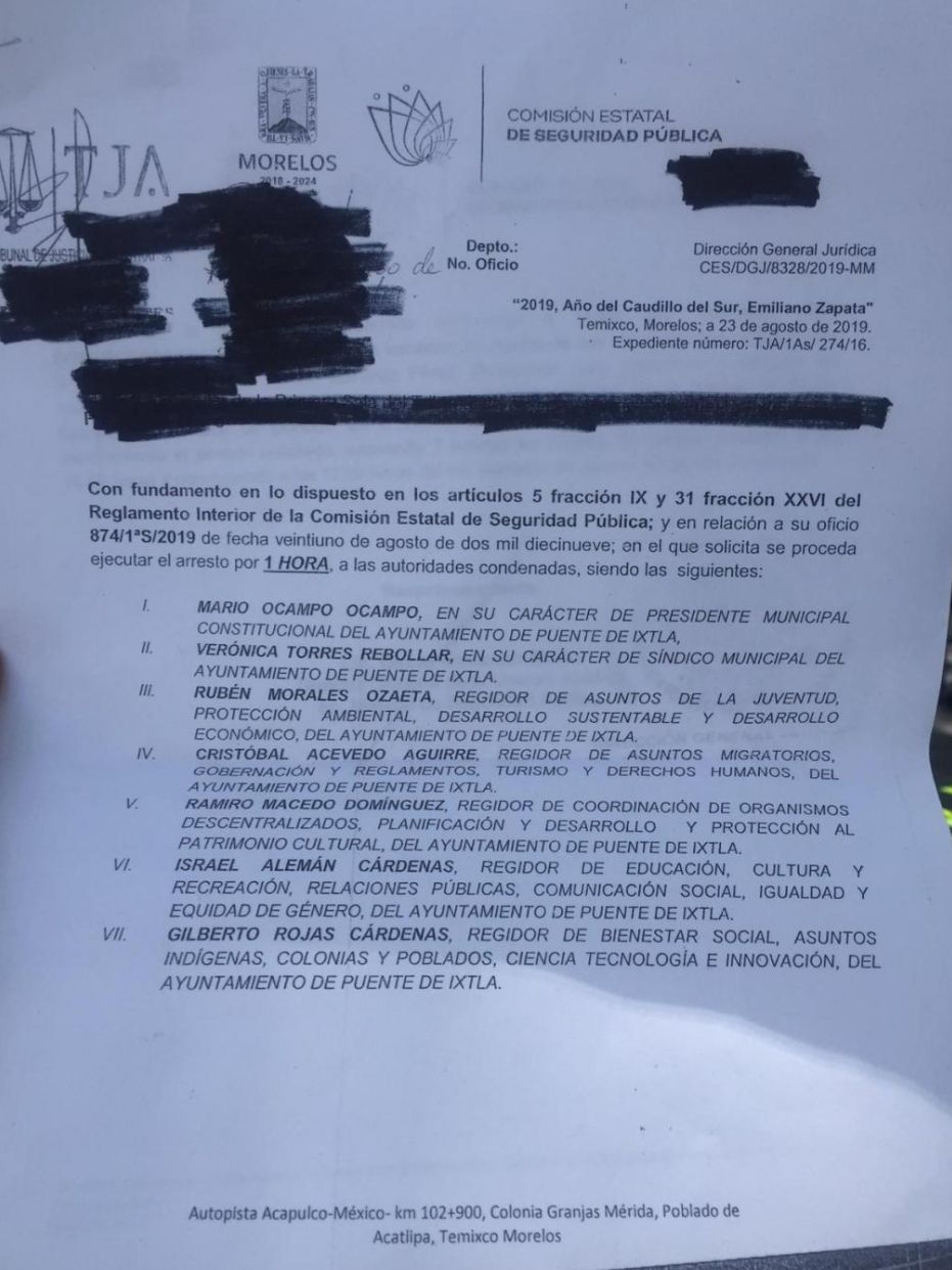 Mario Ocampo, alcalde de Puente de Ixtla, informó que la semana pasada el viernes 23 de agosto, él y seis integrantes de su cabildo fueron arrestados por una hora debido a una orden girada por el Tribunal de Justicia Administrativa (TJA), ante la falta de un laudo laboral del año 2016.