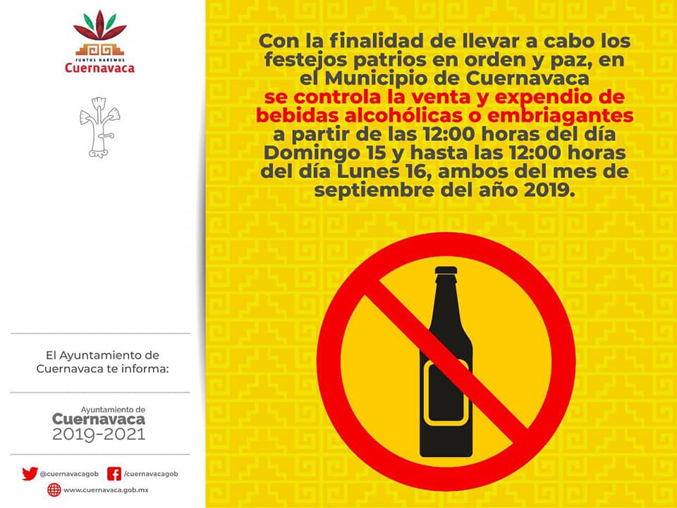 Desde las 12 horas del día 15 de septiembre y hasta las 12 horas del 16 de este año, el ayuntamiento de Cuernavaca controlará la venta de alcohol en la ciudad; es decir, ningún establecimiento podrá venderlo debido a la Ley Seca.