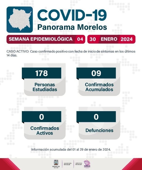 A través de un comunicado, la Secretaría de Salud Morelos, informó sobre el panorama actual en la entidad respecto al COVID-19. Se detalla el estudio de 178 personas de forma acumulada, de los cuales 9 resultaron positivos, sin embargo, no hay casos activos, ni defunciones.