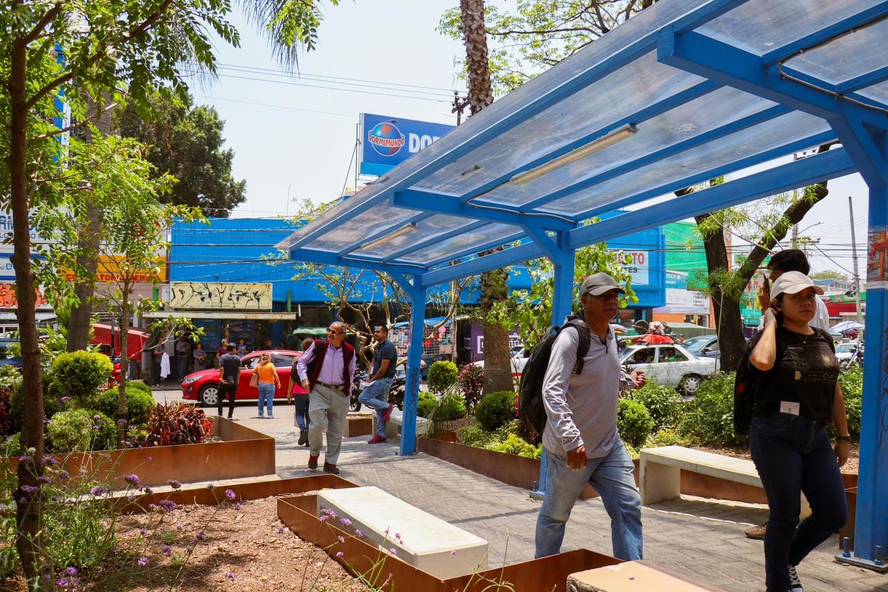 Entre los trabajos realizados destacan la rehabilitación de banquetas con concreto estampado, guarniciones, balizamiento y adoquinado en pasillos interiores conectados al puente peatonal. También se instalaron luminarias, mobiliario urbano, rejillas pluviales para evitar inundaciones y un pergolado metálico.