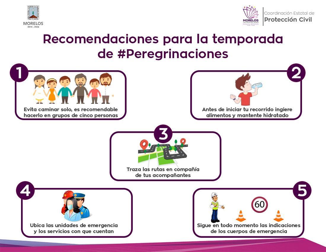 Con la finalidad de prevenir accidentes en Morelos ante la partida y paso de peregrinaciones con motivo de los festejos de la Virgen de Guadalupe, la Coordinación Estatal de Protección Civil Morelos (CEPCM) emitió la siguientes recomendaciones.