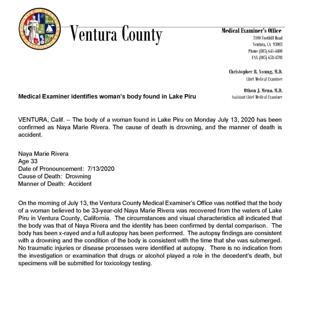 El reporte emitido por los médicos forenses que examinaron el cuerpo de la actriz Naya Rivera, encontrado en el lago Piru de California, concluyó que la causa de muerte fue por ahogamiento accidental.